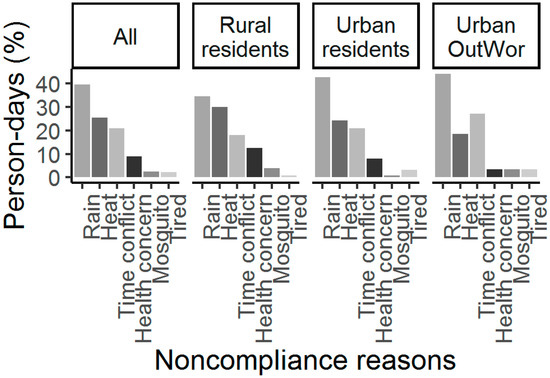 The frequency of self-reported difficulty in intervention compliance is shown in Figure 2. Participants reported difficulty in intervention compliance on 316 (36%) person-days, and Urban residents reported more person-days with difficulty in intervention compliance compared to Rural residents (126 out of 285 (44%) person-days vs. 128 out of 440 (29%) person-days). We observed similar frequencies of reported difficulty between Urban residents and Urban OutWor (126 out of 285 (44%) person-days vs. 62 out of 160 (39%) person-days). The self-reported reasons for difficulty in intervention compliance are shown in Figure 3. Rain, heat, and time conflicts were the leading reasons for intervention compliance difficulties (Figure 3). We presented the factors associated with the probability of intervention compliance in Supplemental File 2. The effect sizes of most fixed effects are small; participants who were physically inactive had a 15.70% (95%CI (8.94%, 22.46%)) reduced probability of intervention compliance.
