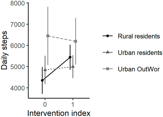 The population average of individual mean steps on baseline and intervention days is shown in Figure 4, where Rural residents and Urban residents walked more steps during intervention although the difference was statistically insignificant (Figure 4). In the mixed models, participants on average walked 637 (95%CI (83, 1192)) more steps on intervention days (Table 2). We did not find a significant interaction effect between intervention and groups (Supplemental File 3). In separate groups, Rural residents had a significant increase of 1063 (95%CI (273, 1851)) mean daily steps during intervention days, after accounting for ambient conditions and other individual-level factors (Table 2). Participants in urban locations had a smaller increase in steps on intervention days compared to Rural residents (Table 2). Participants walked more steps on intervention weekends than intervention weekdays (Supplemental File 4). Intent-to-Treat results and Per-Protocol results are similar; we found slightly lower estimated intervention effect in Per-Protocol, with an average 579 (95%CI (5, 1154)) additional steps on intervention days (Supplemental File 5). Participants had fewer steps on intervention days in the minimal processed dataset compared to primary dataset, with the β estimate of intervention −271 (95%CI (−960, 418)) in minimal processed dataset (Supplemental File 6).