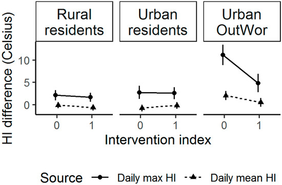 Rural and Urban participants had similar average daily mean or max individually experienced HI on intervention days, but Urban OutWor had significantly lower daily mean or max individually experienced HI during the intervention, after accounting for WS HI (Figure 5). When we included ambient conditions and individual-level factors in models, we found overall participants had a 0.59 °C (95%CI (0.30, 0.88)) lower daily mean and a 1.40 °C (95%CI (0.53, 2.27)) lower daily max individually experienced HI on intervention days (Table 3 and Table 4). An interaction term between intervention and group was significant (Supplemental File 7). In separate groups, Rural residents and Urban OutWor participants on average experienced a 0.49 °C (95%CI (0.09, 0.89)) and a 1.74 °C (95%CI (1.09, 2.38)) lower daily mean HI[individual] during intervention days, respectively (Table 3). Urban OutWor experienced a 6.60 °C (95%CI (4.11, 9.09)) lower daily max HI[individual] during the intervention (Table 4).