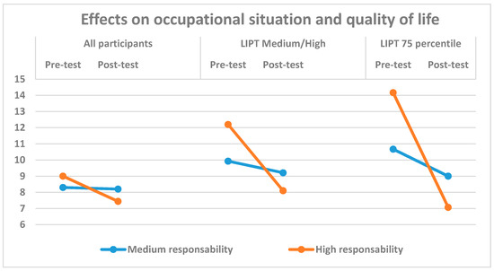 A second ANOVA analysis included inter-group variables such as gender, business or institution size, business or institution public/private character and middle manager’s responsibility level. None of these independent variables produced significant interaction with the previous variables studied between the pre-intervention and post-intervention in the control or experimental groups, with the only exception of responsibility level developed in their work by the middle managers. A significant interaction was shown in the factor effects on occupational situation and quality of life in the experimental group with the manager’s responsibility level, in the comparison with all participants (F(1,89) = 4.28, p = 0.042; η2 = 0.06) and also in the comparison with the participants suffering medium-to-high bullying strategies(F(1,22) = 4.72, p = 0.041; η2 = 0.18). Whereas the variable effects on occupational situation and quality of life in managers with intermediate responsibility level showed similar scores between pre-intervention and post-intervention phases, those with high responsibility showed lower scores in effects on occupational situation and quality of life in the post-intervention than in the pre-intervention phase. Both interactions show a moderate size effect. The 75th percentile bullying strategies subsample was analysed using the non-parametric Wilcoxon signed-rank test, obtaining significant differences between pre-intervention and post-intervention in the experimental group with high responsibility for the factors effects on self-expression and communication (p = 0.028) effects on personal reputation (p = 0.026), effects on occupational situation and quality of life (p = 0.027) and total number of bullying at work strategies (p = 0.027), with lower effects in the post-intervention than in the pre-intervention phase. Figure 1 shows the effects on occupational situation and quality of life in the three comparisons: all participants, LIPT medium-to-high subgroup and 75th percentile subgroup in bullying strategies for medium responsibility and high responsibility in the experimental group between pre-intervention and post-intervention.