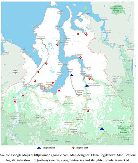 In YNAO, there are 13 slaughter complexes and three slaughter points (Figure 1) near logistical infrastructure—railway or marine logistical routes. In 2019, they slaughtered in total 46,033 reindeer (1643 tons of venison), of which 26,259 (797.5 tons) came from agricultural enterprises, 16,281 (695.6 tons) from “national communities,” 1662 (70.8 tons) from peasant farms, and 1831 (79 tons) from individual reindeer herders []. In 2020, 85% of the interviewed individual reindeer herders had faced some issues due to the COVID-19 pandemic: (1) slaughterhouses sorted out the meat in the most profitable manner to decrease the price; (2) a live reindeer was received by a slaughterhouse but reindeer herders were paid only for the meat, and they had to buy the skins and camuses if they wanted them back or accept the decreased price for the reindeer meat (category II instead of category I); and (3) reindeer herders had to wait up to three months to be paid for slaughtered meat. Sergei S., a reindeer herder, complained about the delayed payment for his products and an unfair deal with a slaughterhouse: “This year, we slaughtered meat at Antipayuta. If we slaughtered a lot of reindeer (more than 100 heads), the money was not paid immediately, but if we slaughtered much less reindeer, then the money was paid immediately. We delivered about a ton of meat and had to wait for the money for two months. We sold meat but skins and camuses were taken by slaughterhouses for nothing. And if you wanted to take them back, you had to buy them. Camuses cost 450 rubles in 2020, and 350 rubles in 2019.” Larisa S., another reindeer herder, was unsatisfied with her dependence on slaughterhouse rules: “You bring a reindeer, they slaughter it and pay only for the meat. If you want to take the camus, then the meat will be cheaper; it will be accepted as of the second sort, and the second sort is phenous meat. That is, we have to sell reindeer and meat according to their terms and conditions.” Slaughterhouses also dropped their prices for meat. In 2020, the average price of venison varied at the slaughterhouses in YNAO from 180 rubles for the second sort to up to 450 rubles for the first sort per kilogram. The reindeer herder Mikhail V. mentioned that the prices had not changed a lot during the past two years: “This year, slaughterhouses took meat for 450 rubles per kg, and the second sort of meat was taken for nothing—180 rubles—and they paid the money much later. In 2018, meat of the first sort was 220 rubles per kg and the second sort of meat cost 140 rubles.” However, reindeer herders had to accept all the terms and conditions imposed by slaughterhouses because, in general, it was more profitable to slaughter a large number of reindeer, especially during the winter high slaughter season.