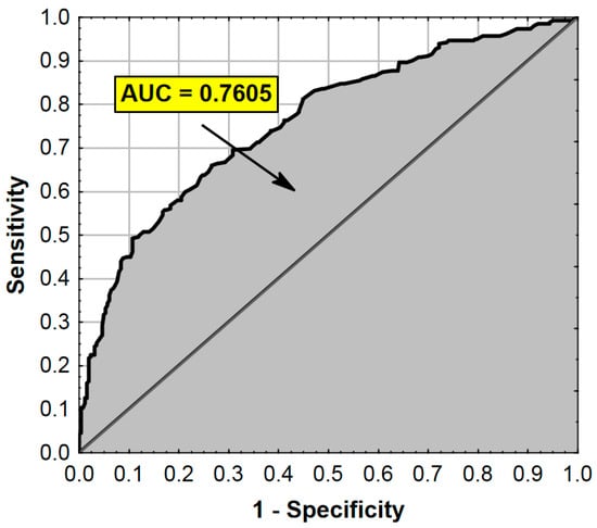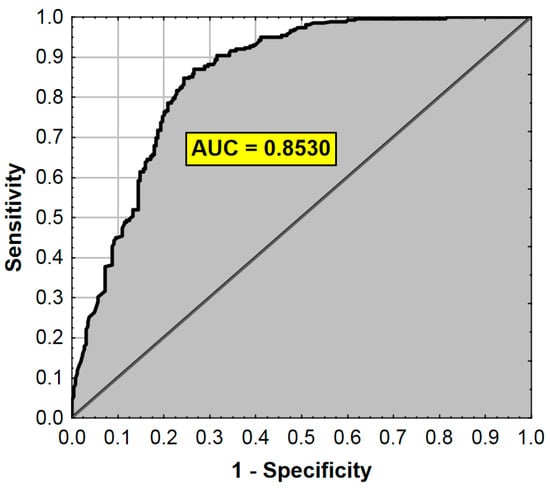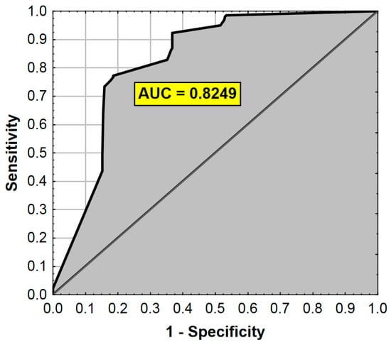 ROC curve and AUC value for the regression model from Table 8. AUC—Area Under the Curve (measure of diagnostic accuracy).