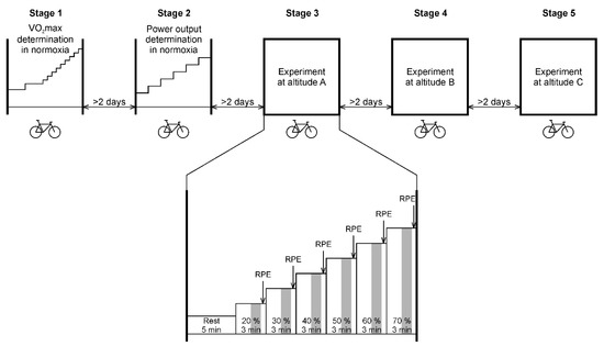 Stage 2 was performed to set and record individual power outputs and cadences (pedaling frequencies) needed to reach particular target HRs matching previously computed values of 20% to 70% of MHRR. For this purpose, power output and cadence were continuously adjusted during pedaling to reach required HR firstly at 20% of MHRR and to keep it steady (i.e., ± 2 beats·min−1) for at least one minute before continuing to the next HR accommodating 30% of MHRR. This process was performed repeatedly up to HR matching 70% of MHRR. The setting procedure was performed in normoxia. Recorded values of power output (watts) and pedaling frequencies associated with particular target HR at 20 to 70% of MHRR were used to create an individual template protocol for testing in the subsequent three experimental stages performed in normoxia and two simulated altitudes of ~1500 m and ~2500 m.