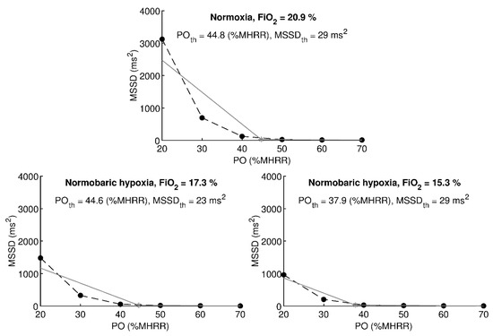 Illustrative example of calculating vagal threshold of one chosen participant at normoxia and two levels of normobaric hypoxia. Black circles and dashed line denote measured data. Grey lines denote regression lines. Grey asterisk indicates vagal threshold point. PO: power output corresponding to a percentage of maximal heart rate reserve in normoxia, MSSD: the mean of the squares of the successive differences between adjacent RR intervals, th: threshold.