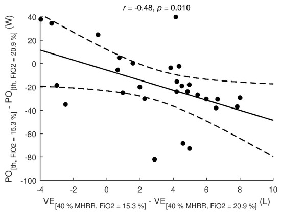 Individual differences in POth between hypoxia of 15.3% and normoxia were significantly (p = 0.010) associated with individual differences in VE between hypoxia of 15.3% and normoxia observed at exercise step corresponding to 40% MHRR in normoxia (Figure 3). The differences in POth were not significantly associated with body mass, body fat, VC, FEV1, Pmax, and VO2max (all p ≥ 0.059) or differences in SpO2, BF, Vt, and RPE (all p ≤ 0.234).