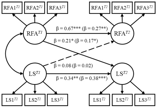 The structural equation model examining the temporal dynamics between reward for application and life satisfaction in study 1 (outside parentheses) and study 2 (inside parentheses). RFA = reward for application; LS = life satisfaction. All the coefficients are standardized, and the solid lines indicate statistical significance. RFA1T1 refers to the first parcel of reward for application at time 1; LS1T1 refers to the first parcel of life satisfaction at time 1. * p < 0.05, ** p < 0.01, *** p < 0.001.