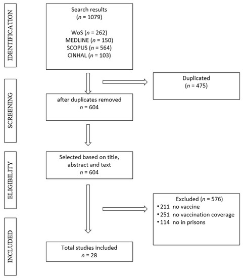The literature search by two reviewers was performed on 20 February 2020 in the electronic databases Web of Science, MEDLINE, Scopus, and Cinhal. The search keywords that were used were: vaccines, vaccination coverage, immunization programs, prisons, prisoners, and inmates in jail. In the search string, the operators “OR” and “AND” were used when relevant, obtaining the following search string: ((((((((“Vaccines”[Mesh]) OR “Vaccines”[Title/Abstract])) OR ((vaccination Coverage[MeSH Terms]) OR vaccination Coverage[Title/Abstract])) OR ((Immunization Programs[MeSH Terms]) OR Immunization Programs[Title/Abstract]))) AND ((((((“Prisons”[Title/Abstract]) OR Prisons[MeSH Terms])) OR ((prisoners[MeSH Terms]) OR prisoners[Title/Abstract])) OR “inmate”[Title/Abstract]) OR “jail”[Title/Abstract])) AND Humans[Mesh]). No language or time limit were applied to the search.
