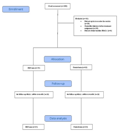 Two hundred patient charts were screened. A total of 69 patients met the inclusion criteria for our analysis. Of those, 34 patients received SMS in addition to usual care (intervention arm) and 35 received usual care (control arm). Figure 1 specifies reasons for exclusion. The two most common reasons for exclusion were missing baseline or follow-up HbA1c.