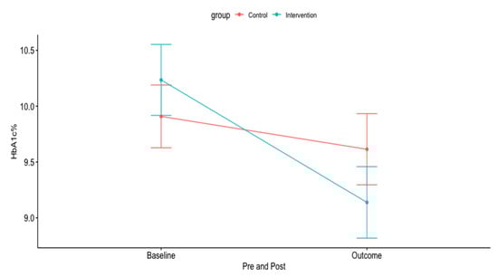 Pre-post hemoglobin A1c (HbA1c) reduction in the control and intervention arms.