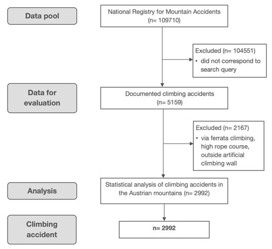 The Ethics Committee of the Medical University of Innsbruck approved the study (AN2016-0018 358/4.8 390/5.5) and it was registered with Clinical Trials (NCT03755050). Anonymized data on emergencies and rescue operations in the Austrian Alps are collected by officers of the Alpine Police and stored in the digital National Registry for Mountain Accidents. As qualified alpinists, these officers have basic medical training (first aid and basic life support). As soon as a person requires a professional rescue, an entry is made in the registry. By 31 October 2018, this registry had grown to one of the largest registries for mountain accidents worldwide, containing more than 109,710 entries. Rock climbing-related accidents from initiation of the registry on 1 November 2005 to 31 October 2018 were extracted and analysed (Figure 1).