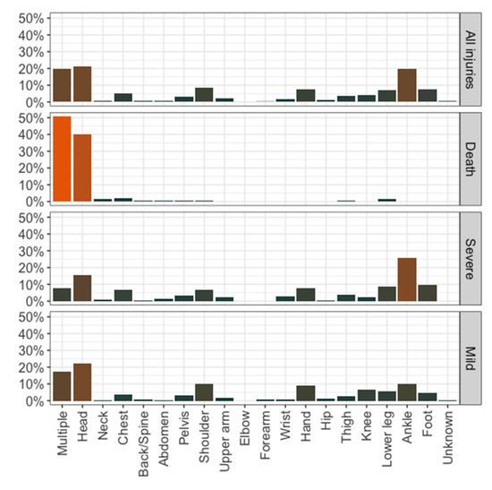 Nearly half of all persons involved remained uninjured (Table 2). Of these, 82.7% were performing alpine climbing, and the most common causes of an emergency were being lost or trapped (n = 474), being an uninjured companion, unable to continue climbing (n = 441), or exhaustion (n = 172). When injuries occurred, the majority were severe, and mostly involved the ankle (n = 181; 25.5%) or the head (n = 110; 15.5%; Figure 2). Additionally, injuries to the lower leg (n = 61; 8.6%) and the foot (n = 69; 9.7%) were more pronounced. The main causes of severe injuries were rockfall (n = 94), grip or foothold break-out (n = 91), or a belaying error (n = 81). This mainly led to a fall with rope impact or a fall with ground impact, and predominantly resulted in fractures (n = 523; 73.8%). Mild injuries were more equally distributed, but with peaks in the head (22.3%) or multiple-located injuries (17.1%; Figure 2). Here, rockfall (n = 92) and stumbling and falling (n = 36) accounted for nearly half of all known causes, and primarily led to contusions, strains, sprains (n = 130) or wounds, lesions, and lacerations (n = 115). Fatalities occurred in 4.7% of all cases. The main causes leading to death were injuries affecting multiple localizations (n = 71; 50.7%) or the head (n = 56; 40.0%; Figure 2). Three quarters of the 140 deaths (n = 105; 75.0%) were classified as a multiple trauma, and n = 110 occurred after a fall with ground impact.