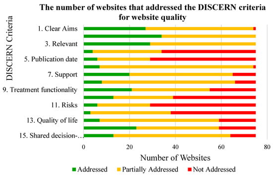 The number of websites out of the total 75 websites that addressed, partially addressed, and did not address each of the 15 DISCERN criteria. The DISCERN criteria include: (1) Are the aims of the website clear and is the target population of the website clear; (2) Does the website achieve the intended aims; (3) Is the website relevant to the needs of the user (in this case, firefighters with post-traumatic stress disorder (PTSD)); (4) Are the sources of information used for the website clear (i.e., proper referencing); (5) Does the website provide publication dates for the sources of the information included; (6) Does the website provide balanced and unbiased information (i.e., regarding treatment options for PTSD); (7) Does the website provide links to additional sources of information and support for treatment choices; (8) Does the website refer to area of uncertainty when it comes to the best treatment choice; (9) Does the website include information about how the treatments work (i.e., effects on the body, the condition, and the symptoms); (10) Are the benefits of each treatment explained; (11) Are the risks of each treatment explained; (12) Does the website explain what happens when the condition is not treated; (13) Does the website explain how the treatment will affect quality of life and activities of daily living; (14) Does the website make it clear that there are different possible treatment options; (15) Does the website promote discussing treatment choices with all involved in the patient’s care (i.e., shared decision-making) [,].