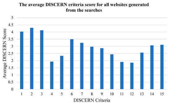 The average score of each of the 15 DISCERN criteria, based on the average of all 75 websites from the searches. Each DISCERN criteria is rated between 1 (does not address) and 5 (does address). The DISCERN criteria definitions can be found in Figure 1.