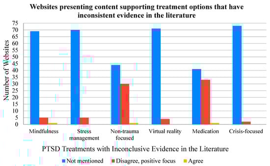 The number of websites that agreed or disagreed with the evidence-based statements for the potential treatments that have inconclusive evidence to support their effectiveness. Additionally included are the number of studies that did not mention the potential treatments. All studies that disagreed with evidence-statements had a positive focus and only presented the evidence to support the treatment effectiveness. None of the websites disagreed with a negative focus, meaning that the unsuccessful treatment of PTSD was not mentioned.
