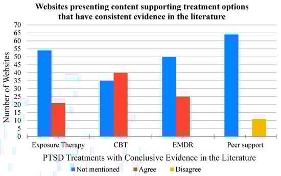 Of the 60 websites that mentioned treatments, the most frequently mentioned treatments were medications, cognitive behavioural therapy, and non-trauma focused therapies, although medications and non-trauma focused therapies were not supported by conclusive evidence. Websites in the current study did mention treatments supported by strong evidence, but many promoted the use of treatments with inconclusive evidence or no evidence. When there were inconsistencies between the available evidence and the presented content, all but two of the websites included only the research results that supported the treatments and did not mention any evidence against the use of the treatment for PTSD. The presentation bias can lead firefighters to overlook treatments with strong evidence, selecting instead a treatment with inconclusive evidence. Similar results were found in a study by Griffiths and Christensen [] who assessed the quality of online information for depression. The authors explained that many of the websites they reviewed did not mention scientific evidence to support their claims. In addition, the authors found websites that did include evidence to support the treatment recommendations did not elaborate on the strength of the evidence that they referenced []. Moreover, Griffiths and Christensen identified 53 different interventions recommended for depression across 21 websites, many of which were presented without scientific evidence []. Similarly, in the current study, some websites promoted treatments without evidence-based support from randomized control studies and systematic reviews (e.g., equine therapy, essential oils, or yoga), and some websites even stated that these treatments were ‘evidence-based’ without providing a reference. Firefighters need to carefully and critically assess with the information available online to support actual evidence-based decision-making regarding their health and avoid potentially ineffective and expensive treatments that can hinder their recovery.