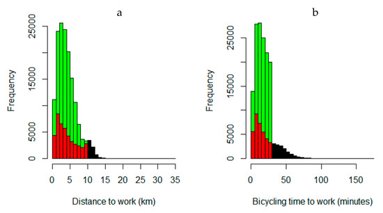(a) Distribution of bicycle distances to work. (b) Distribution of travel times to work by bicycle.