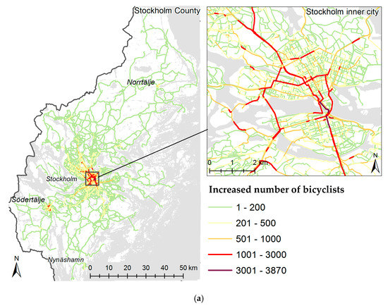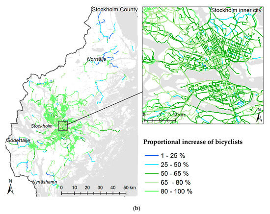 The geographical distribution of increased bicycling is presented in Figure 2a as the additional number of bicyclists on each part of the road network within the whole county and the inner city of Stockholm. The largest increase occurred in the inner city, where the number of bicyclists increased by up to 3870 per day on some parts of the road network. Corresponding proportional decreases are presented in Figure 2b.