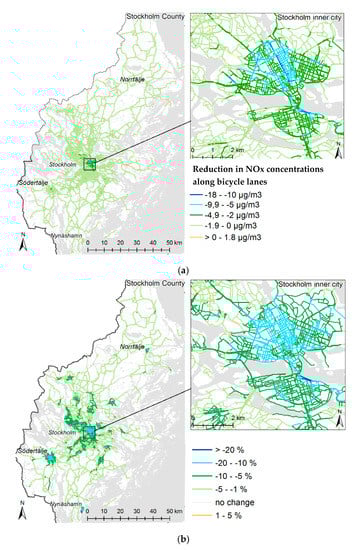 Up to a 13.8 μg/m3 reduction in traffic contribution to NOx concentrations was calculated along the road network, as shown in Figure 3a. This corresponds to up to a 21% reduction in the traffic contribution to NOx concentrations (Figure 3b). The mean reduction in concentration for the whole area was 6%, with the largest reductions occurring in the most densely populated areas. A higher mean NOx concentration was found along roads available for driving compared with bicycle paths before the mode-shift, 23.2 vs. 16.6 µg/m3.