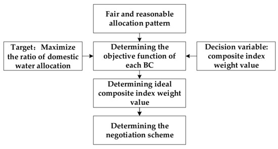 The NS of each BC was determined by considering the selection preference of each BC. We assume each BC is a rational agent. When each BC negotiates with other basin countries, it tends to choose the weight value that is most conducive to its own water resources allocation [29,32]. Therefore, firstly, based on the idea of flexible weight, the composite index weight values are set as the decision variable. Secondly, the objective function of each BC was constructed by referring to the fair and reasonable allocation pattern. Then, the ideal weight value and NS of each BC were obtained. The process of determining the negotiation scheme of each BC is shown in Figure 3.