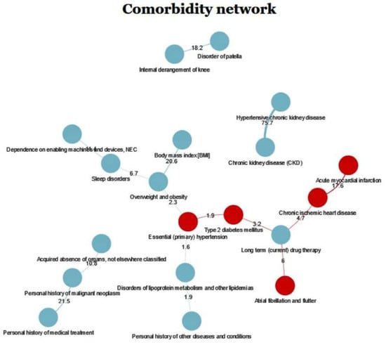 The comorbidity network for new users of lipid-lowering drugs is shown in Figure 1. Red indicates diseases related to CVD or CV risk factors, such as diabetes or hypertension. All other diseases are shown in blue. Diagnoses of chronic ischemic heart disease and acute myocardial infarction co-occurred 17.6 times more often than expected by chance, and were also associated with long-term drug therapy. Among the other diseases recorded, the strongest association was observed for hypertensive chronic kidney disease and chronic kidney disease (which co-occurred 75.7 times more often than expected by chance).