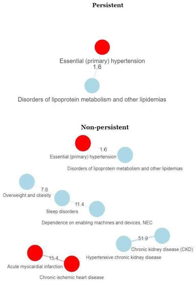 To the best of our knowledge, this is the first study to perform a comorbidity network analysis of patients treated with lipid-lowering drugs. This analytical approach provides us with a broader perspective of the clinical profile of individual patients, who may have multiple comorbid diseases or conditions. Comorbidity network analysis is a novel approach to the study of differences in morbidity between groups (in this case persistent versus nonpersistent patients) [,]. Our comorbidity networks revealed an association between dyslipidaemia and hypertension for the entire study population (i.e., for both persistent and nonpersistent users). This association is well documented in the literature []. We also observed several interesting associations for illnesses other than CVD. CV risk factors have been associated with airflow obstruction [], and this association was observed for the entire group studied and for the nonpersistent group. A study conducted in the UK reported high rates of CVD among individuals who also had malignancies []. The researchers found that some of these co-occurrences could be attributed to lifestyle factors. Although we observed no association between malignancies and CVD in our study population, malignancies were more frequent than can be explained by chance in the entire dyslipidaemia cohort, supporting this hypothesis. Finally, we observed differences in comorbidity between persistent and nonpersistent subjects. Comorbidities were more prevalent in nonpersistent patients. This fact could be explained as a consequence of non-persistence, but also as a cause, because patients with a high number of diseases tend to reduce drugs to the minimum necessary number. The strong association observed between chronic kidney disease and hypertensive kidney disease in non-persistent deserves further research, as it could be related to adverse effects or to other coprescriptions, which could be also the reason of non-persistence. The most important difference between groups related to concurrent diagnoses of chronic ischemic heart disease and acute myocardial infarction; this combination of diagnoses was only detected in nonpersistent patients, and may be explained by the poorer management of cholesterol levels in this group. Nonetheless, this result should be interpreted cautiously.