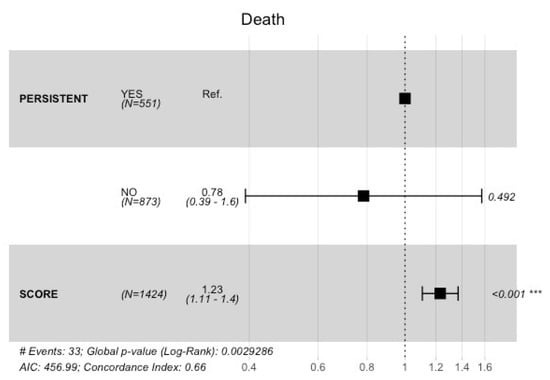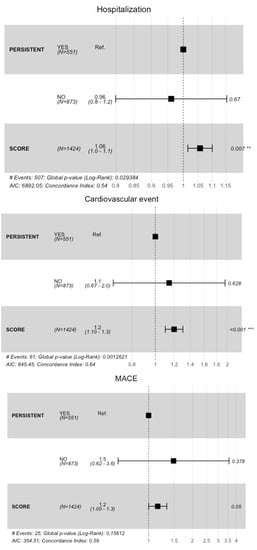 Comorbidity networks stratified according to SCORE values are provided in Supplemental Material S1. Table 3 and Figure 3 show the results of the multivariate analyses. Table 3 shows the risk of all-cause hospitalization, CVD events, MACE, and death among nonpersistent users, compared with persistent users and adjusted by SCORE value. After adjusting by SCORE, nonpersistent users had a higher risk of all-cause hospitalization, CVD events, and MACE than persistent users. Although none of these differences were statistically significant, the difference between groups in the risk of all-cause hospitalization approached significance (p = 0.060). Higher SCORE values were associated with a higher probability of hospitalization, CVD events, MACE, and mortality.
