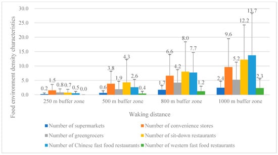 Among the three types of stores, convenience stores had the best access, with the most number and nearest distance, followed by greengrocers and supermarkets. Among these three types of restaurants, sit-down restaurants had the easiest access in most buffer zones, followed by Chinese fast-food restaurants and western fast-food restaurants. Among all types of food outlets, western fast-food restaurants had the worst access, whose nearest distance of two communities even reached more than 8000 m. Detailed information on participants’ neighborhood food environment density characteristics and proximity characteristics is shown in Table 2/Figure 1 and Table 3/Figure 2.