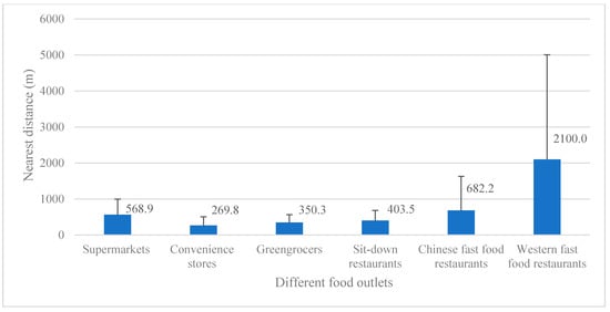 The food outlets were classified into different types. Study investigators used knowledge of the local area food chains coupled with the National Economic Industry Classification (GB T 4754-2017) [], Tian Yancha [], and Dianping [] to refine the list mentioned previously to different types. Tian Yancha is a website for querying corporate information, including industrial and commercial information, and the information is accurate and reliable. Tian Yancha data come from the National Enterprise Credit Information Disclosure System, China Judgment Documents Network, China Enforcement Information Open Network, State Intellectual Property Office, Trademark Office, Copyright Office, and other authoritative websites. Dianping is a website offering local business search, user-generated reviews, detailed business information, and other merchant services. The definition of different types of food establishments was based on National Economic Industry Classification. Then, we divided all food outlets into different types by checking their business scope in Tian Yancha and Dianping. The list mentioned previously was refined to the following categories: (1) supermarket (comprehensive retail activities in supermarkets that sell fresh food, processed food, pre-packaged food, and daily necessities, etc.); (2) convenience store (retail activities in the form of small supermarkets to meet the proportional needs of customers as the main purpose, such as convenience stores and small grocery stores with limited selection); (3) greengrocer (retail activities specializing in fresh vegetables and fruits); (4) sit-down restaurant (catering activities that provide a variety of dishes for lunch and dinner in a certain place, and deliver meals by the waiter, such as Chinese dinners, western dinners, hot pots, etc.); (5) Chinese fast-food restaurant (fast and convenient Chinese catering services in a certain place or through specific equipment, such as Chinese set meals, fried rice, noodles, steamed buns, local cuisines, etc.); (6) western fast-food restaurant (fast and convenient western catering services in a certain place or through specific equipment, such as McDonalds and Kentucky Fried Chicken, pizzerias, limited-service facilities, such as Subway, etc.). Some food outlets present in the neighborhoods were excluded from the study because they did not fit the classifications used, such as bars, coffee shops, dessert shops, etc.