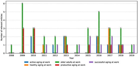 The selected keywords aimed to show different aspects on the literature corpus on aging at work. Figure 2 presents the number of potentially relevant papers that contained the defined keywords and that were additionally filtered manually based on their relevance to the defined properties per year. A relatively similar number of identified articles can be observed in the evaluated time period. “Active aging at work” is the keyword with the smallest number of occurrences. The most frequent keyword phrase in the identified publications is “older adults at work”. The number of research articles did not grow in the period of interest, but articles that address the associated keywords seem to be distributed more evenly over time.