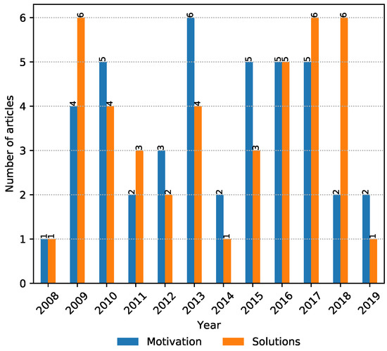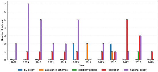 The focus of papers within the “solutions” property group (Figure 5) seems to move from “national policy” based to “legislation”, while “assistant schemes” and “EU policies” seem to be of smaller interest for the scientific community. There was only one paper that addressed “eligibility criteria”, which makes this topic interesting for further research.