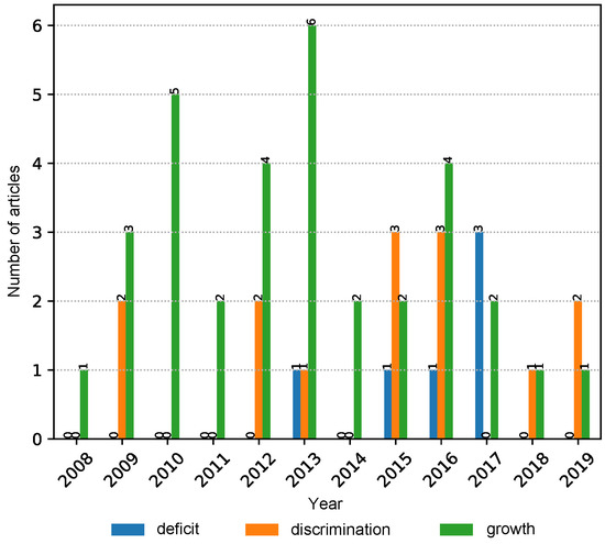 A more granular analysis was carried out on the property groups data at the properties level, and the chart reveals that “growth” is the primary topic within the motivation group of papers, followed by “discrimination”. The papers related to the topic of “deficit” appeared only in recent years (Figure 4).