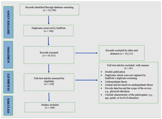 In total, we screened 10,453 documents with 166 studies meeting the selection criteria (see Figure 1). The selected literature was published between 1998 and 2020. The first study reporting physical activity was an intervention study in 1998 []. Meanwhile, the first study reporting sedentary behavior was a case-control study in 2004 [].