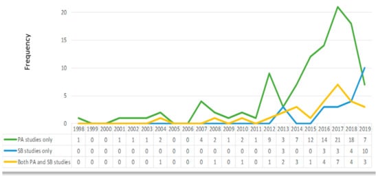 Similar to other LMICs, as well as the wider international literature, the number of physical activity studies was higher than that for sedentary behavior in Indonesian youth [,]. In comparison with physical activity epidemiology, sedentary behavior research is much more recent [], which may provide a reason for the smaller number of sedentary behavior studies. While the landmark study in physical activity epidemiology was published in 1953 by Morris and colleagues [], the first publication of a physical activity-related study on Indonesian youth was found in 1998 []. Meanwhile, the first publication reporting on sedentary behavior in youth was found in 2004 []. This finding is consistent with global studies of sedentary behavior that increased sharply in the early 2000s [] and the literature of sedentary behavior in Bangladesh, another Asian LMIC [].