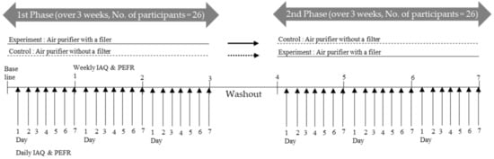 The original study procedures were related to human participants and approved by the research ethics committee of Inha University Hospital (IRB No. 2018-07-007), and written informed consent was obtained from the legal guardians of all participants. In this randomized double-blind crossover intervention study, we placed one air filtration unit (Tower_XQ600, ATXH663-HWK, Winix, Korea) in the bedroom or main living space of each participant’s home for two separate intervention periods, which lasted for three weeks each. These intervention periods had a washout period of at least one week (Figure 1) in between. To adjust for seasonal effects, we conducted measurements of IAQ and lung function within one season, that is, the fall of 2018 (September to October).