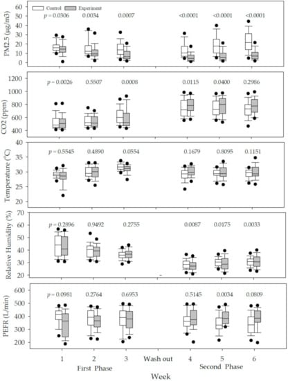 Figure 2 shows the distributions of IAQ and PEFR measurements by week and phase. The indoor PM2.5 levels were significantly lower (p < 0.05) in the experiment (filtered) group than in the control (unfiltered) group regardless of the week or phase. However, in the case of PEFR, there was some decrease, especially in the first phase; however, this was not statistically significant.
