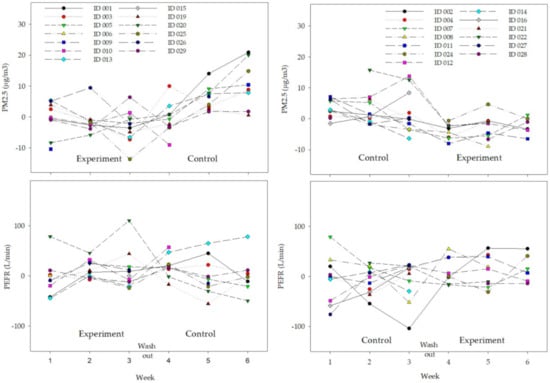 As seen in Figure 3, the distributions of weekly differences in PEFR or PM2.5 values from their overall median value, obtained over the entire study period, demonstrated lower indoor PM2.5 values in the experiment group for both phases. PEFR levels were similar or slightly lower in the experiment group than in the control group.