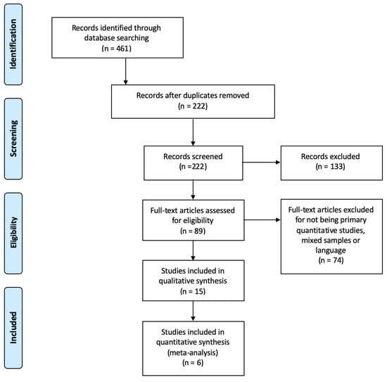The search showed a total of 461 studies. After eliminating the duplicates, the number was reduced to 222 studies. There were 89 studies that were selected after reading the title and abstract. Then, after reading the full-text, 15 studies [30,31,32,33,34,35,36,37,38,39,40,41,42,43,44] were selected applying the inclusion criteria and 6 of them had the necessary data for the meta-analysis. All studies passed the critical reading process. The selection process is shown in Figure 1.
