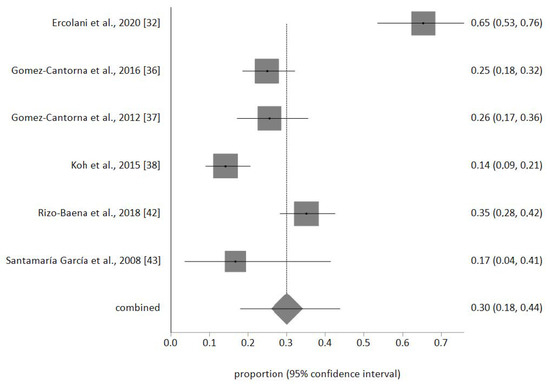 EE prevalence showed a range between 7% [32] and 30.4% [36]. The mean score of EE from different studies showed a low level [34,40,43]. The prevalence rates are shown in Table 2.