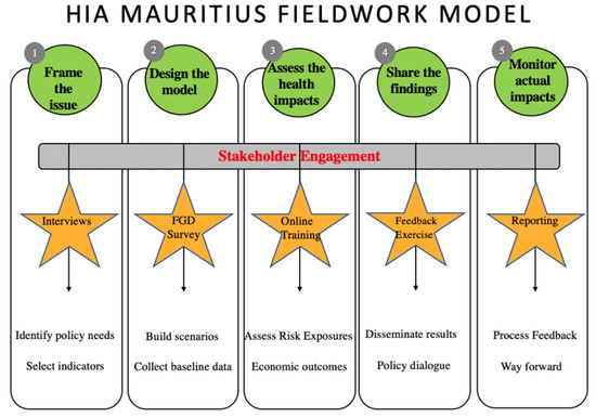 This study aims to fill these gaps by focusing specifically on participation in quantitative HIAs, in the sector of urban transport planning and in the context of low- and middle-income countries (LMICs). It builds on previous work addressing the lack of participatory quantitative HIA models to assess the overall burden of mortality and morbidity related to urban transport planning and the implication of HIA practice for stakeholders to establish policies in favor of healthy and environmentally sustainable cities [19,20,24,25,26]. It addresses the research question: what are the different components of a participatory quantitative model and how can these influence HIA implementation? Two sub-questions are addressed: (1) what resources are needed to conduct PQHIA in an LMIC setting? (2) What factors are likely to influence PQHIAs and the uptake of their outcomes? Our starting point is that PQHIA can be applied to different urban contexts to assess the health consequences of different environmental and lifestyle determinants within policy scenarios. Our PQHIA framework was developed based on fieldwork in Mauritius and then discussed for applicability in cities of LMICs.
