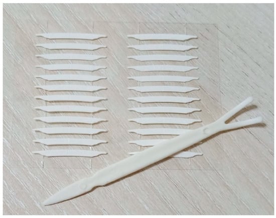 Then, participants were supplied with a set of double eyelid tapes and its application tool (Original Equipment Manufacturer (OEM), Qingdao, China), shown in Figure 1. Participants were taught to use the pointed end of the applicator to take out the tape from its packaging, then apply it around 4 to 6 mm above the upper eyelid margin. The white, non-sticky outer later sheet was then removed before the Y-shaped applicator was used to gently push the upper eyelid upwards to create an eyelid fold. This was followed by a gentle pinch on the newly created eyelid fold to ensure the adhesion of the double eyelid tape. Participants were also taught to clean their eyelids using a wet cotton pad, gently with a circular motion to remove excess dirt or oil on the eyelid, before applying the double eyelid tape to enhance its adhesion, and to repeat the step in order to loosen the tape adhesion for its removal. Participants wore the double eyelid tape for no less than five days in a week without other eye makeup and contact lens wear and for at least eight hours per day.