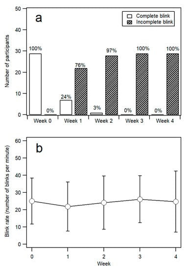 (a) Blink pattern (completeness of blink) and (b) mean blink rate (number of blinks per minute) from Week 0 (before eyelid tape wear) to Week 4. Error bars represent ±1 standard deviatiom (SD).