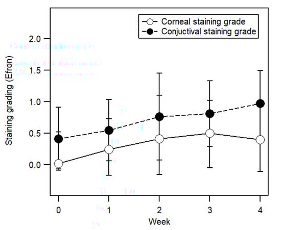 Conjunctival staining grade also showed a similar increasing trend from Week 0 to Week 4 (Figure 3, closed circles). In Week 0, the mean grade was 0.41 ± 0.50 (95% CI (0.23, 0.60)) and reached a peak grading of 0.97 ± 0.52 (95% CI (0.78, 1.15)) in Week 4. The rankings of conjunctival staining varied significantly across the five visits (Friedman two-way ANOVA, (χ2F = 20.93 (corrected for ties), df = 4, N–Ties = 29, p < 0.001)). Conjunctival staining grading in Week 2, Week 3, and Week 4 was significantly higher than that for Week 0 (Wilcoxon Signed Rank pairwise comparisons, all p < 0.05).