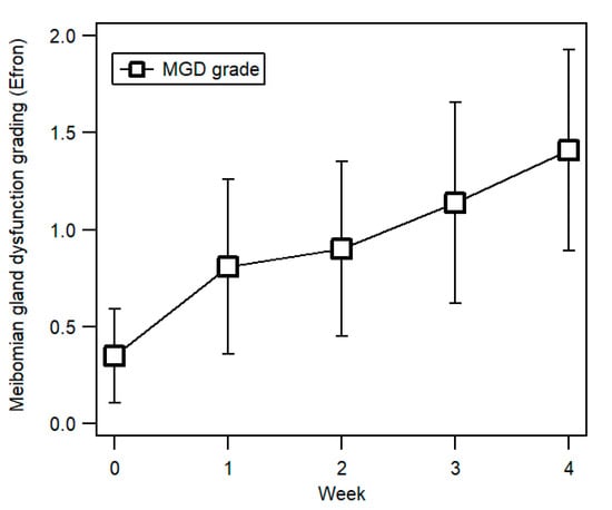 The grading for meibomian gland dysfunction (MGD) showed an increasing trend from Week 0 to Week 4, as evident in Figure 4. In Week 0, the mean MGD grade was 0.35 ± 0.24 (95% CI (0.26, 0.43)), reaching a peak grade of 1.41 ± 0.52 (95% CI (1.22, 1.60)) in Week 4. A Friedman two-way ANOVA indicated that rankings of MGD grading increased significantly across the five visits from Week 0 to Week 4, (χ2F = 72.76 (corrected for ties), df = 4, N–Ties = 29, p < 0.001). Follow-up pairwise comparisons with the Wilcoxon Signed Rank test showed that MGD grading between Week 0 and the other four weeks varied significantly (all p < 0.001).