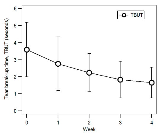 Mean of tear break-up time (TBUT) measured in seconds from Week 0 (before eyelid tape wear) to Week 4. Error bars represent ±1 SD.