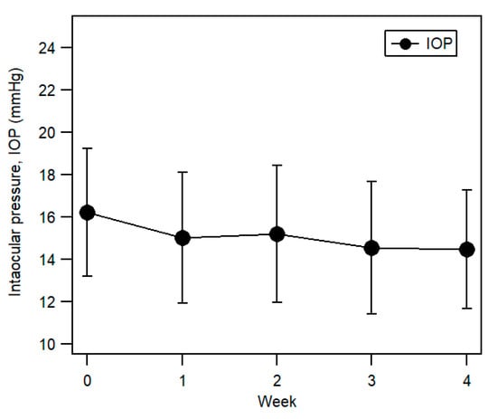There was a decreasing trend in IOP (Figure 6) between Week 0 (16.21 ± 3.03 mmHg (95% CI (15.10, 17.31)) and Week 4 (14.45 ± 2.81 mmHg (95% CI (13.43, 15.47)) and was statistically significant (F (3.45, 96.46) = 4.41, p < 0.01, partial η2 = 0.14). Pairwise comparisons further revealed that the IOP on Week 1, Week 3, and Week 4 were significantly lower than Week 0 (all p < 0.05).