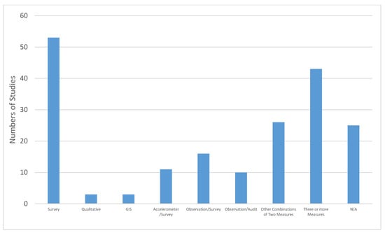 | Longitudinal study design Route: Bicycle and walking trails in neighborhoods Volume of traffic Destinations Neighborhood Lighting—well-lit streets Neighborhood outdoor play Ease of access to 14 facilities or destinations including Parks Playing fields Swimming pools Recreation center or YMCA/YWCA. | [67] | 2002–2011 | Actigraph accelerometer, Questionnaire | Non-school physical activity declined for both boys and girls from the 6th to the 8th grade. The facilities that were easiest to get to were parks, playing fields, paths or trails, and swimming pools. A majority of the sample said that there was crime in their neighborhood, as well as, enough traffic to make it hard to walk. Study—youth participants (53.5% white; 18% Black; 19.1%; Hispanic; 4.8% Asian, Native Hawaiian or Pacific Islander) reporting that children do not play outdoors in the neighborhood, that their neighborhood was well lit, and that there were trails in their neighborhood at baseline, were each associated with significant decreases in non-school Met-Weighted -MVPA at 2-year follow-up. No neighborhood measures were associated with sedentary behavior. MET-weighted MVPA (MW-MVPA), and sedentary behavior. |