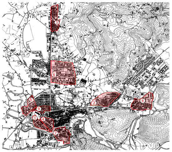 The target area of the study includes nine districts out of a total of 15 (60%), accounting for about 55% of the built surface of the town (Figure 1); in these districts, about 33% of the population lives. The inner city was not included in the investigated area, since, by nature, it is already “pedestrian-friendly”. In fact, the study focused on other districts, where, due to their characteristics, the motorization process competes with walking.