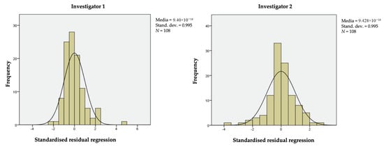 The ICC used for this study is that applied for a two-way random-effects ANOVA system [,], since the data collected by the first and the second investigator are modeled as random effects. With the random variables πI (raters) and λj (encounters) assumed to be independent and distributed with N(0,), N(0,) (see the standardized residuals regressions reported in Figure 2), the ICC formula (Equation (1)) for the model is: