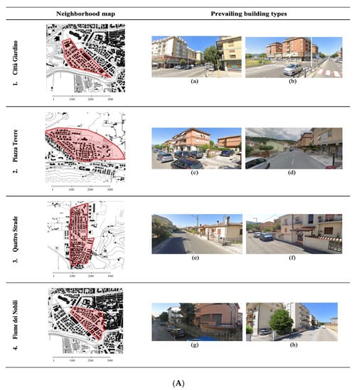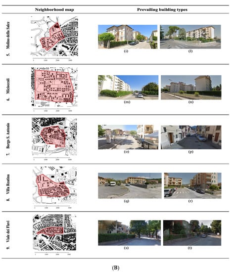 (A) Neighborhood map and prevailing building types of Città Giardino (1—a,b), Piazza Tevere (2—c,d), Quattro Strade (3—e,f), Fiume dei Nobili (4—g,h) districts. (B) Neighborhood map and prevailing building types of Molino della Salce (5—i,l), Micioccoli (6—m,n), Borgo S. Antonio (7—o,p), Villa Reatina (8—q,r), Viale dei Flavi (9—s,t) districts.