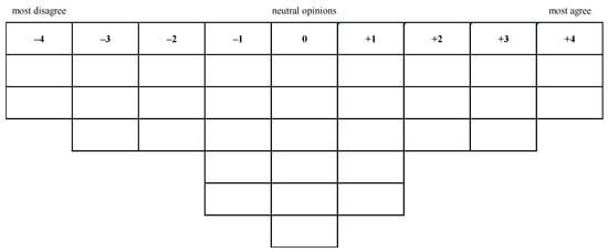 We collected information about the participant demographics, including age, gender, marital status, education, and income level, using a questionnaire. The participants gained information on a dementia prevention program by reviewing a brief document that included existing literature suggesting a dementia prevention program [12]. The program included three categories of physical training (e.g., hand-eye coordination training and agility training), brain fitness (e.g., memory training and calculation training), and self-care (e.g., nutritious diet, sleep physiology, and inter-personal skills). The participants were asked to review the program before Q-sorting and were told that this was the dementia prevention program referred to in the Q-statements during the subsequent Q-sorting. Next, participants conducted Q-sorting, subjectively ranking the 32 Q-statements using a 32-cell grid. Each statement was printed on a small card for the participant to read and rank. We asked the participants to rank 32 Q-statements to be placed in a large poster, shown in Figure 1, prepared in advance according to the levels of agreement. We illustrated the operating procedure to participants, provided 32 cards with statements and requested them to review all of the statements carefully. The participants were asked to place the two statements that they agreed with the most (+4, positively labelled) in the far right column and the other two statements they disagreed with the most (−4, negatively labelled) in the far left column. The participants repeated the procedure in the next column (+3 and −3) by selecting three agreed and three disagreed statements from the remaining statements. The procedure was repeated until the Q-sort grids were all completely filled. We allowed the participants to adjust their sorting decisions at any time until the participants did not wish to make any further changes.